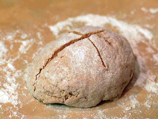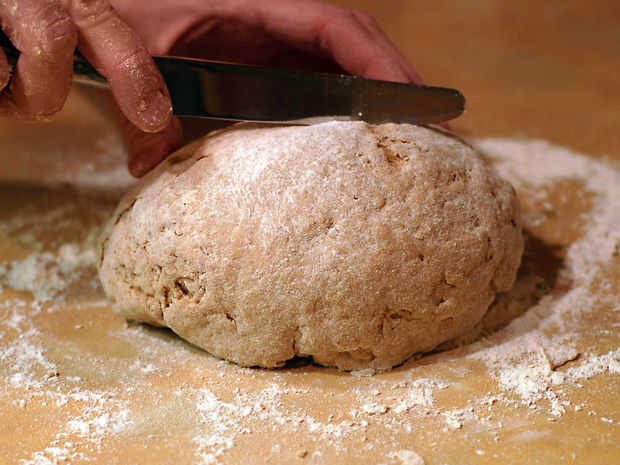 Cuidadosamente coloque la masa en una bola algo oblonga (piensa en rugby) y puntuación de la parte superior en ambos sentidos aproximadamente media pulgada profunda con un cuchillo.