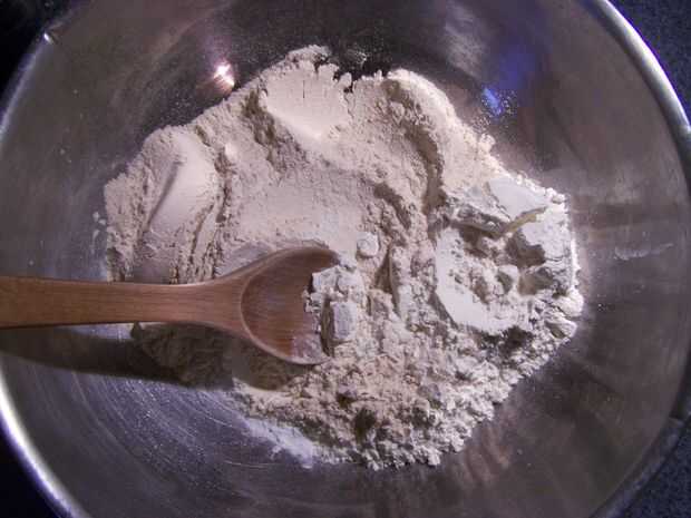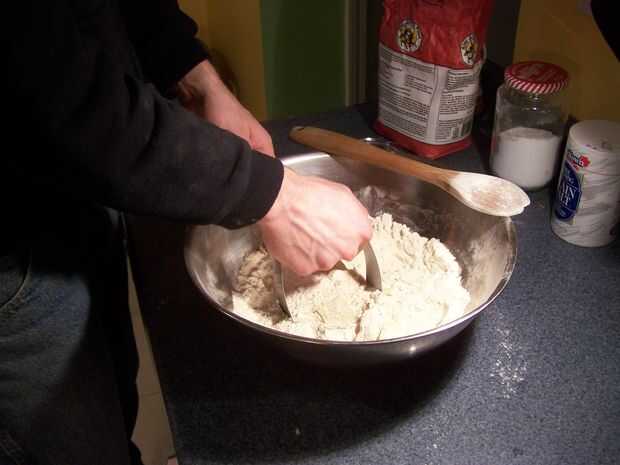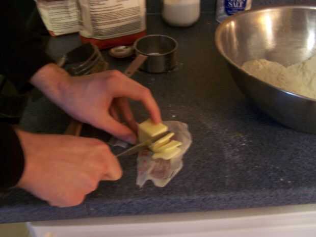 Luego, corte la mantequilla en rebanadas delgadas. Pongan estas rebanadas de su harina y use la batidora de repostería para cortar la mantequilla en la harina. Si no tienes un cuchillos de mantequilla dos de repostería licuadora pueden utilizarse. Empuje hacia abajo con la batidora de repostería, periódicamente se mezcla con él. Retire cualquier mantequilla que se queda atascado y lugar nuevo en el recipiente. Hacer esto hasta que la mezcla una vez más se asemeja a un polvo, con no trozos de mantequilla restantes.