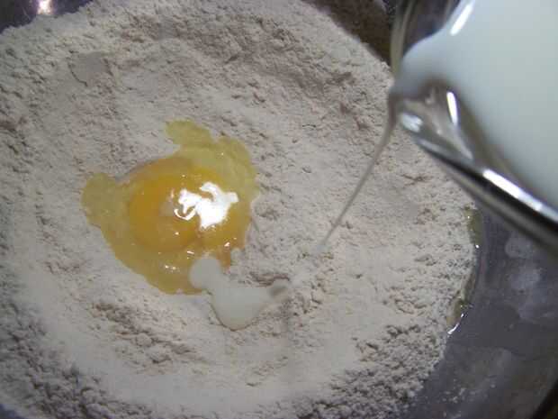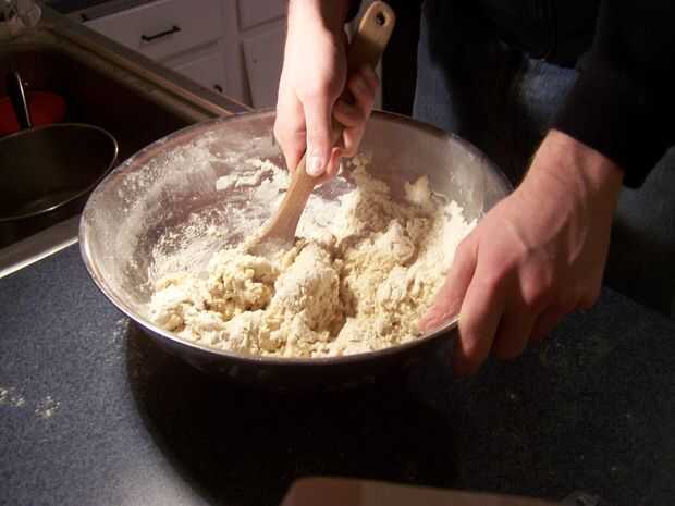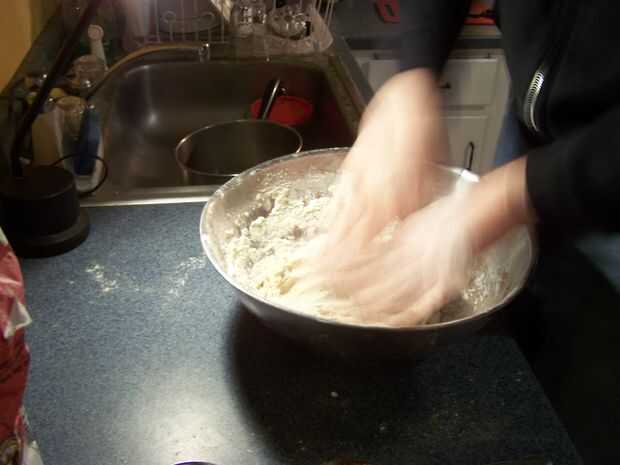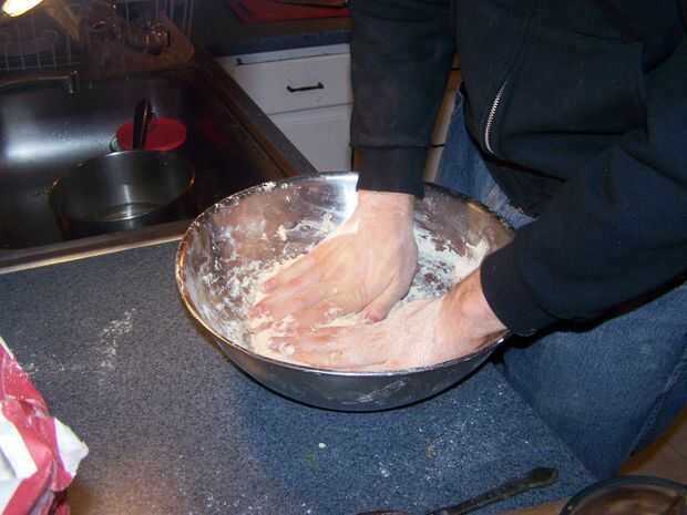 Cuando la masa se ha reunido (la mayor parte de la harina es integrado) y tiene un peludo mira a él, quitar la pasta de la cuchara en el tazón de fuente. Las manos de harina bien, asegúrese de que conseguir algo entre los dedos. Amasar la masa en el recipiente durante 1-2 minutos. Doblar la masa por la mitad, presionar, doblar otra vez.