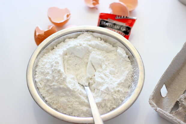 En un recipiente aparte tamizar harina, polvo para hornear, goma xantana y la sal. Mezclar los ingredientes secos a los ingredientes húmedos. Una vez hecho doble fresas en la mezcla. Colocar en molde untado con mantequilla y poner en el horno. Hornear el pan durante 60 minutos o pegue una selección de diente en el pan, si sale limpio el pan está hecho (la parte superior llevará un poco más larga).