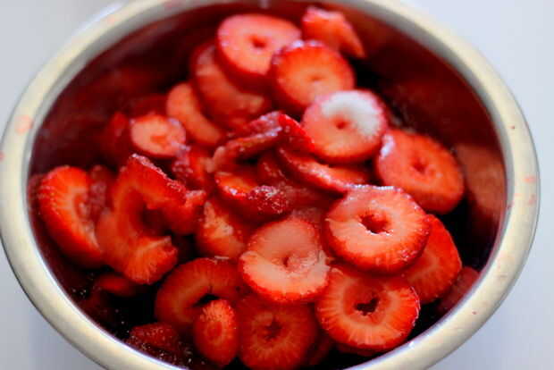 Instrucciones de la receta: Precalienta el horno a 375; en un recipiente colocar 2 tazas de fresas y espolvoree 2 cucharaditas de la mezcla de azúcar y reservar. En un tazón grande usar una batidora y mezclar la mantequilla derretida y el azúcar; poco a poco agregue los huevos, leche y vainilla y mezclar hasta que todos los ingredientes se mezclan en.