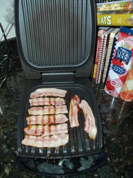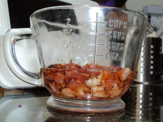 Cocinero hasta crujientes, desmenuzar y agregar grasa espalda que al medir. Me gusta cocinar mi tocino en una parrilla de George Foreman, no salpique la cocina en la grasa de tocino y las diapositivas grasa, que hace que sea un poco más fácil de agregar la espalda grasa en después de que desmenuzan hasta medir. He utilizado 8 rebanadas de tocino cortado grueso.