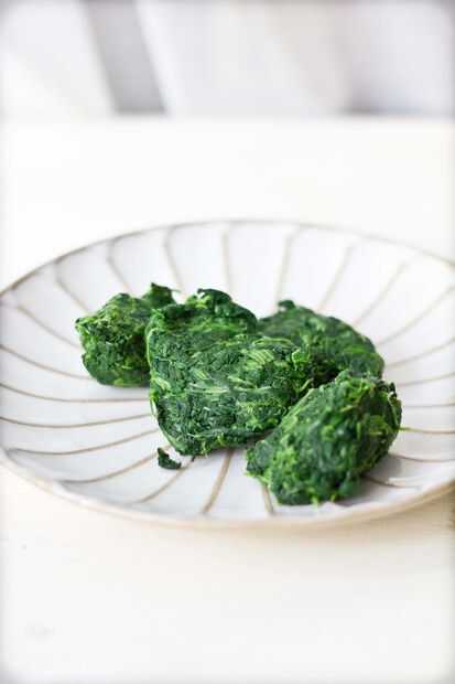Más rallado espinacas viene congelado. Si lo tuyo es muy importante exprimir la espinaca entre tus palmas sobre un fregadero para drenar el exceso de agua. Continuar haciendo esto hasta que sólo unas pocas gotas de agua salen de la espinaca cuando se aprieta, y luego apartar la espinaca.