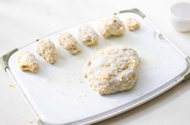Cortar trozos de la masa de queso y crear 4 tortuga patas de 2 pulgadas de ancho y 4 pulgadas de largo, 1 la cabeza de la que es de alrededor de 3 pulgadas de anchas, 3 pulgadas de alto, y 5 pulgadas de largo y una cola de tortuga que es cerca de 1 pulgada de ancho y 3 pulgadas de largo. Todavía debe tener una buena cantidad de la masa caseosa izquierda. Aplanar la masa restante en un óvalo que es aproximadamente la misma área que la cáscara de espinacas.