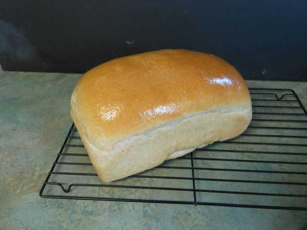 Cuando retire las cacerolas y poner sobre una rejilla para enfriar. Poner un poco de grasa (mantequilla) en la parte superior del pan para una corteza superior brillante.