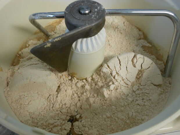 Añadir la levadura y la harina de trigo integral (1/2 de la cantidad total de harina)