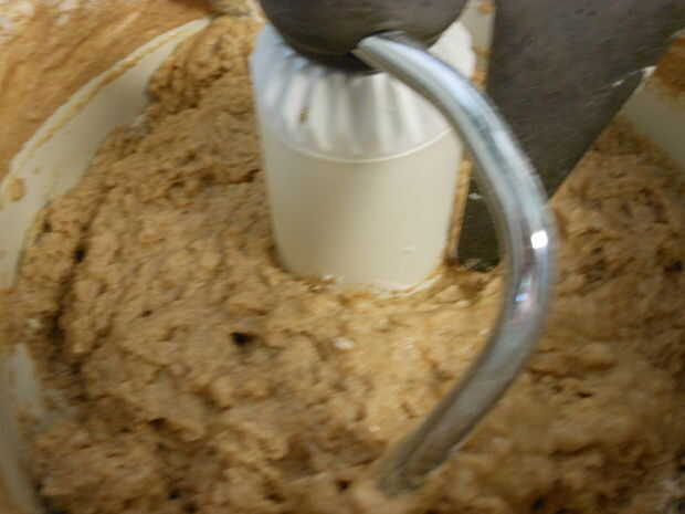 Encienda el mezclador hasta que se mezcle.  Apagar y tiro una toalla sobre la batidora y dejar leudar una media hora.  Ahora es un buen momento para discutir cómo funciona la levadura.  La levadura es un organismo vivo que se alimenta de azúcares y carbohidratos complejos (harina).  Cuando come, produce los productos derivados del alcohol y CO2.  El gas de CO2 necesita un lugar para ir por lo que crea poco y a veces más grandes, espacios en el pan y eso causa el gluten para estiramiento y el pan se levantan, los pequeños agujeros que encontrará en el pan donde el gas, hasta de la hornada del gas, cocido por el alcohol y endurece el gluten.