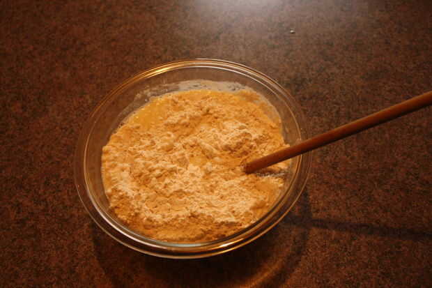 ingredientes:1 1/2 tazas harina de maíz1/3 taza de harina de cocoAlmidón de la tapioca de 1 TB (podría sustituir la fécula de patata)1 1/4 cucharadita de salgoma de xanthum 1/2 cucharaditaMiel de 3 TB4 huevos1 1/2 tazas leche3 TB derretido mantequill