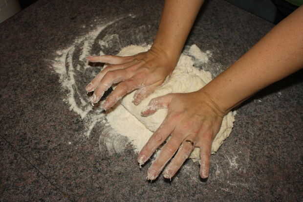 Gire sobre una superficie bien enharinada, amase hasta liso y elástico, aproximadamente 5 minutos.