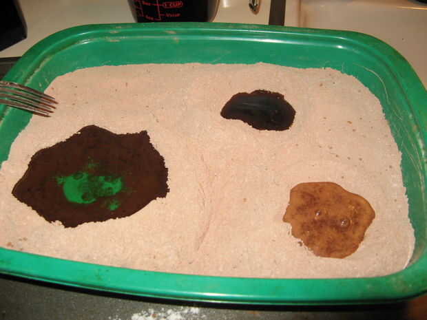 Forma 3 pozos en la mezcla.  Vierta el aceite en el pozo más grande, vinagre en el medio y la vainilla en el más pequeño.