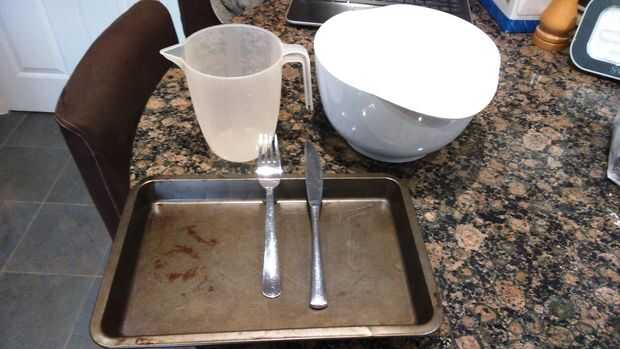 Usted también necesitará una bandeja de horno, un recipiente grande, una jarra medidora y algo con. Me gusta usar un tenedor y un cuchillo, pero si prefieres algo diferente, utiliza.
