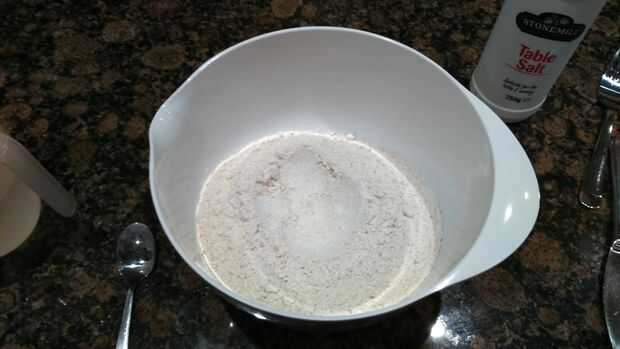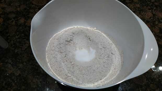 Tomar 4-5 tazas de harina (alrededor de 950-1100 gramos) y pegue en el recipiente.