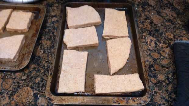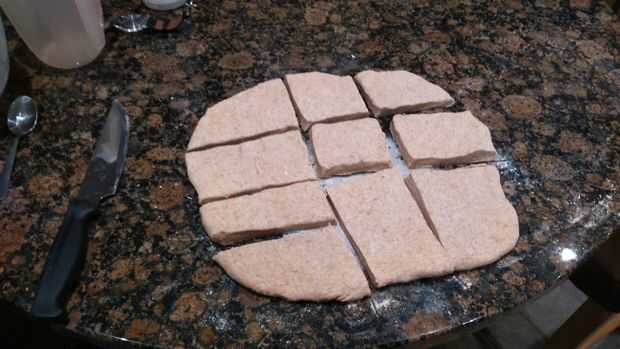 Una vez que haya terminado el amasado, el rodillo la masa en forma de square-ish 1/2 una pulgada de espesor. Utilice un rodillo para alisar hacia fuera si usted quiere. Una vez que hayas hecho esto, tomar un cuchillo y cortar en cuadrados o cualquier forma adapte a su fantasía.