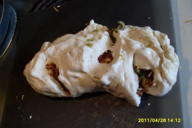 Tomar un raspador de banco (o bol) y picar las barras izquierda y derecha y amasar para distribuir los ingredientes.  Repetir una vez más.