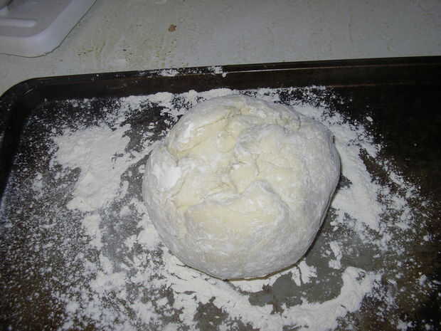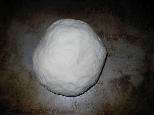 Ahora, vencer a la masa y amasar una vez más (con una batidora, amasar un minuto o menos. A mano, amasar un par de minutos). Forma y enrolle la masa en una bola. Para una corteza más gruesa, más difícilmente, rodar la pelota en harina (mi esposa prefiere el pan con una corteza más fina).