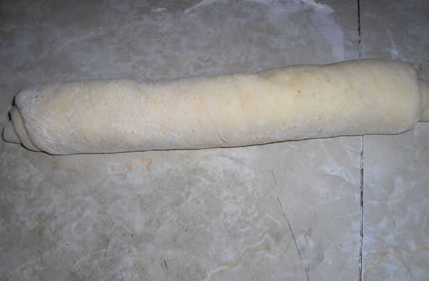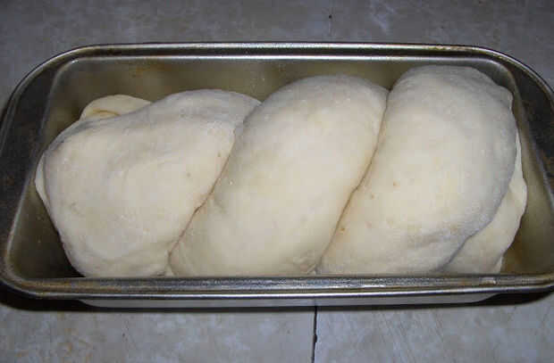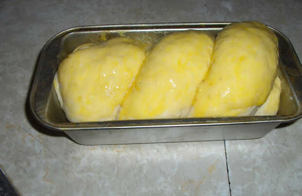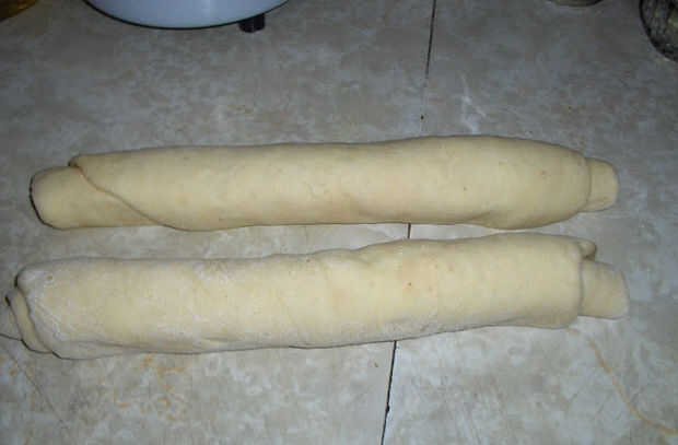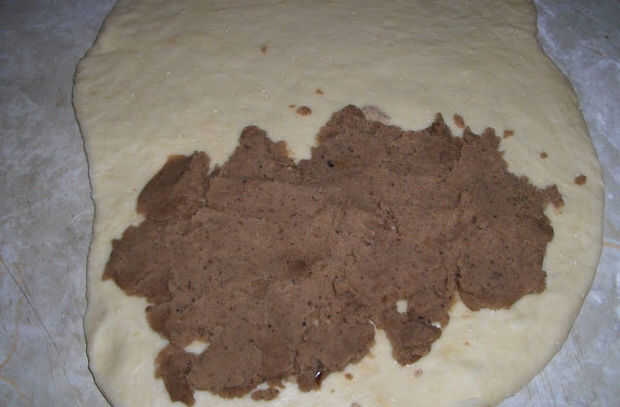 Después de masa ha aumentado, puesto hacia fuera sobre una tabla espolvoreada con harina pan y dejarlo reposar 5-10 minutos. Dividir la masa en dos mitades. Pat a o estirar cada mitad con un rodillo. Esparza la mitad con pasta de frijol rojo y la otra con puré de castañas. Enrollar la masa como un rollo de jalea y tuerza tanto masa y coloque en un pan. Deje reposar por 30 minutos.
