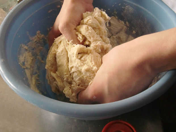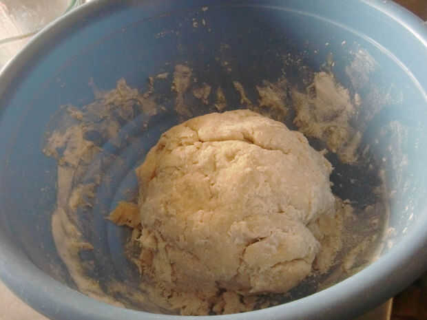Mezcle todos los ingredientes excepto la harina. Luego agregue lentamente la harina hasta que la masa haga una bola.