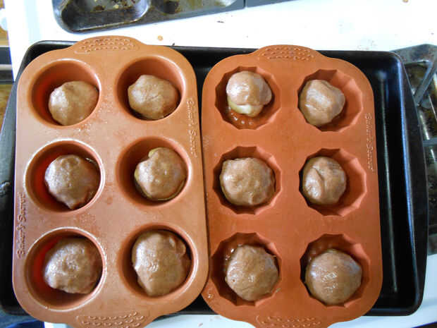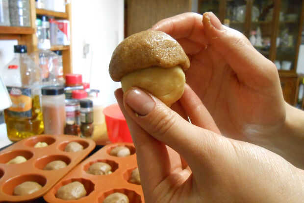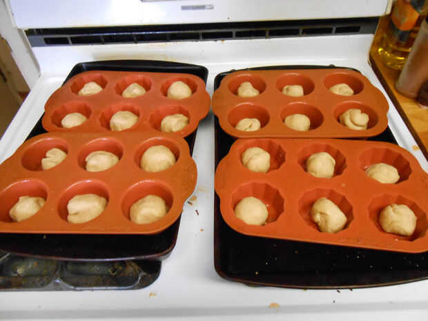 Rodar cada pieza en una bola y coloque en una cacerola engrasada del muffin.