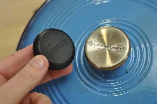Estoy usando una olla de "horno holandés" esmaltado hierro fundido Lodge marca. Lodge es más asequible que algo como una Le Creuset. Lo único que no me gusta sobre ella es que viene con un pomo de plástico para la tapa. Cuando ordené mi Lodge de hierro fundido, también ordenó una perilla de repuesto de marca Le Creuset. La perilla Le Creuset es metal parece más agradable y es el horno a una temperatura más alta que la perilla de plástico Lodge. Intercambio de botones sólo requiere un destornillador y puede realizarse en unos 30 segundos.