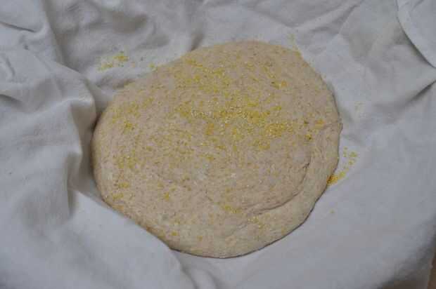 Establecer el té toalla o paño sobre un tazón y espolvorear un poco de harina o harina de maíz en él. Poner la bola de masa en allí, espolvoree un poco más de harina en la parte superior y cubrir con el resto de la toalla.