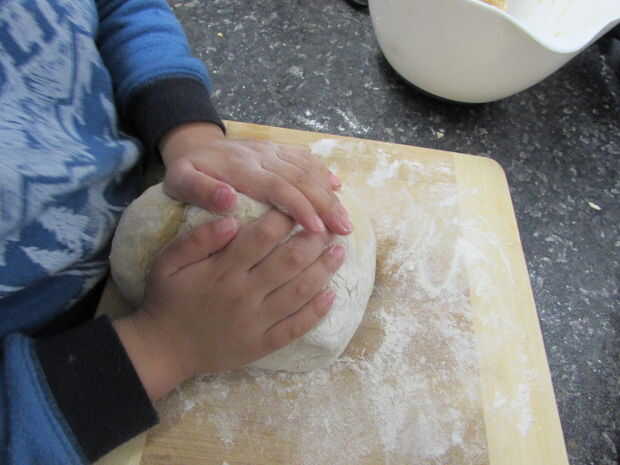 • Esparcir harina en la superficie y amasen la pasta durante 10 minutos hasta que esté suave. Este es el paso donde divertía mi pequeño ayudante.