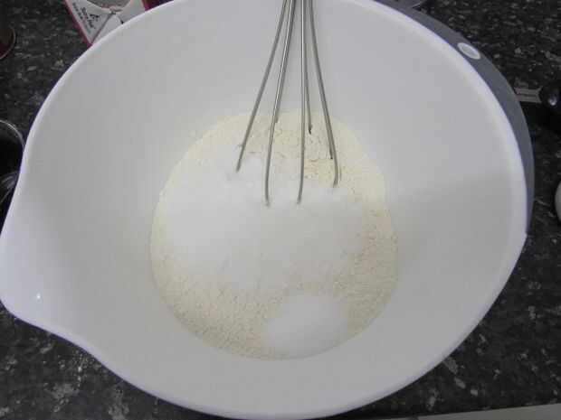 • En un tazón grande, bate la harina, la sal y la azúcar hasta combinar.