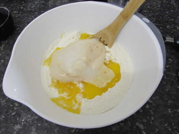 • Hacer un pozo en el centro de la mezcla de harina y agregar en la mezcla de leche, mantequilla, huevos y levadura. Revuelva con una espátula o cuchara de madera hasta que se mezcle. (Tener su leche y los huevos a temperatura ambiente. Cocinados en el microondas la mantequilla cada 20 segundos hasta que derrita. Asegúrese de que la mantequilla no esté demasiado caliente cuando se mezcla. Nosotros no queremos matar a la levadura).