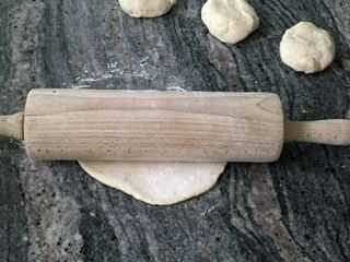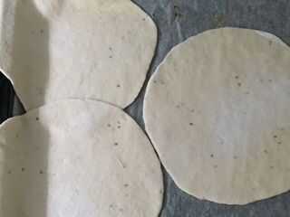 Usando un perno de balanceo y enharinados de la plataforma de trabajo estirar cada bola en un círculo. No importa si no lo consigo un círculo perfecto, se forma más tarde.