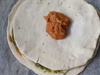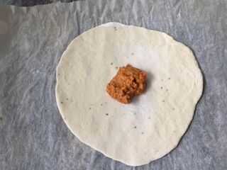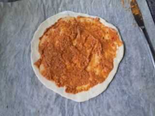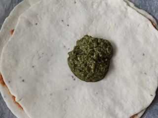 Con una cuchara Coloque 2-3 gotas de pesto rojo sobre la masa circular. (Consejo: trate de no dejar atrás el aceite tanto como sea posible)