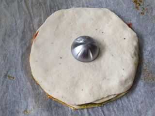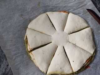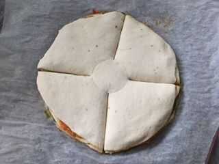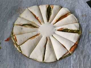 Con un cuchillo corta la masa en 4 líneas (12:03:06 posición-a partir de este centro del círculo. (Dejar la parte central) Ver imagen para mayor claridad.