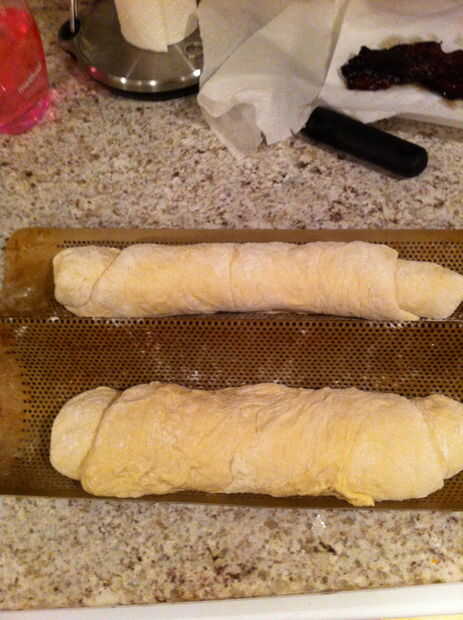 Baje cada lado de la costura longitudinal y set de baguette en una hoja de pan o de la hornada de baguette.  Cubra y deje reposar por otros 15-20 minutos.