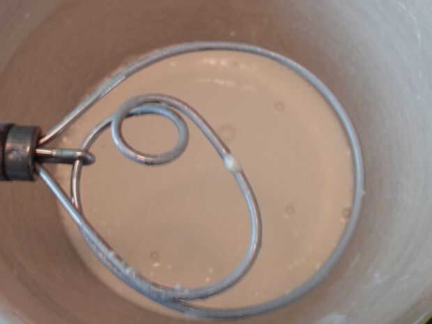 Pour la prueba levadura en un tazón grande. Luego agregar la yema de huevo hasta color uniforme. Ahora agregue tres tazas de harina. Golpe muy duro durante 1 minuto aproximadamente o hasta que se mezcle completamente (a mano). Después de la cubierta con el abrigo plástico superior, deje levar durante 15 a 20 minutos.
