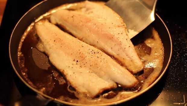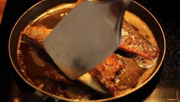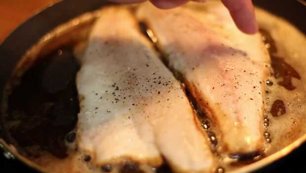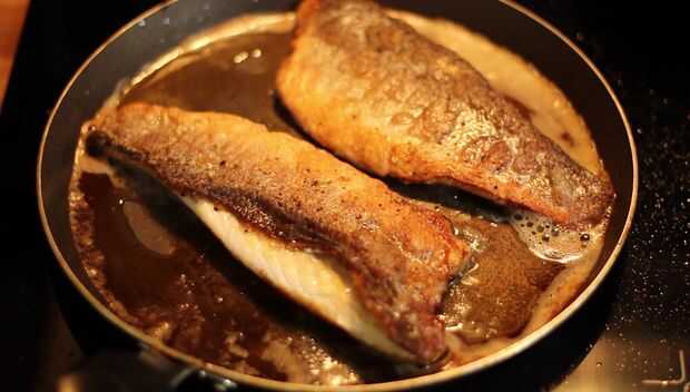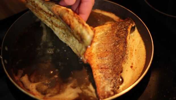 Después de 4-5 minutos, verá el borde del pescado en los puntos más finos a un color blanco claro, cuando esto sucede es el momento de girar el pescado. Llevarse un trozo de pescado y con mucho cuidado voltee el pescado, mantenga cerca de la bandeja no asi a la mantequilla de splash en todas partes y los peces delicados en una sola pieza. Cocinar el pescado durante 2-3 minutos más, siga chequeando para asegurarse de no cocine demasiado / quemar.