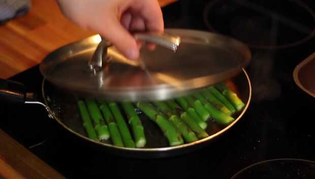 Espárragos realmente no mucho, tan pronto como los tallos son tiernos utilizar algunas pinzas y sacarlos de la sartén, poner a un lado de la galjanoplastia para arriba más adelante.