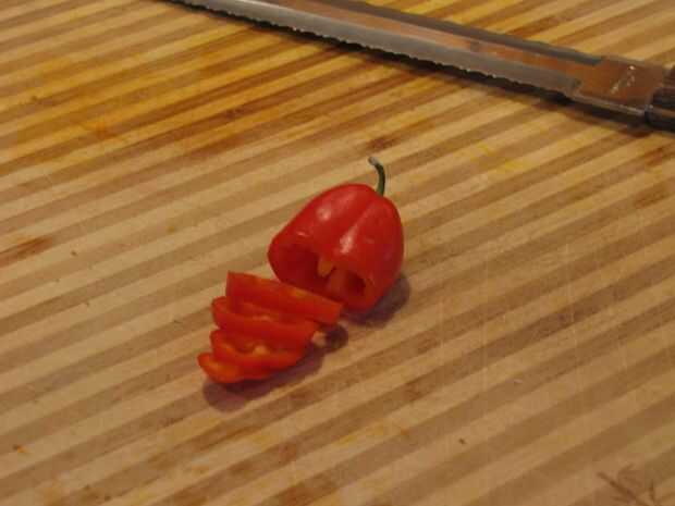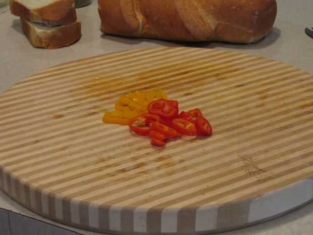 Entonces usted necesitará cortar los pimientos horizontalmente en tiras finas.