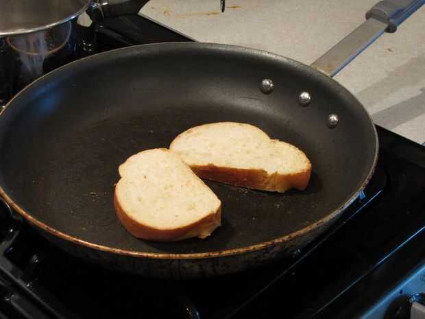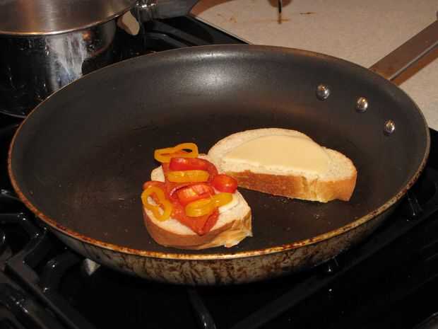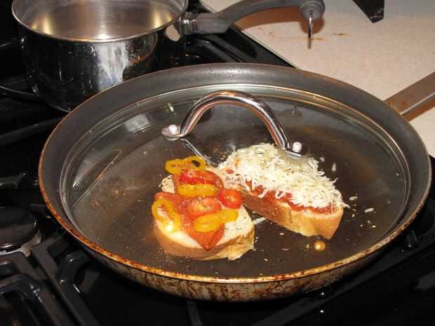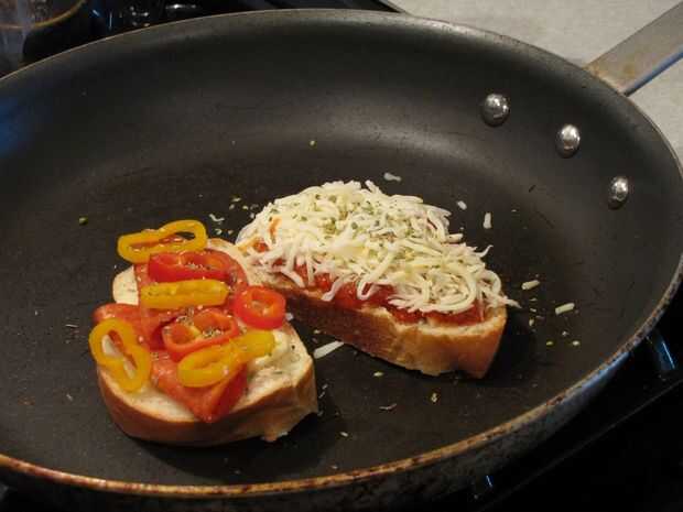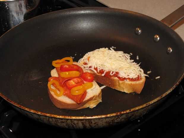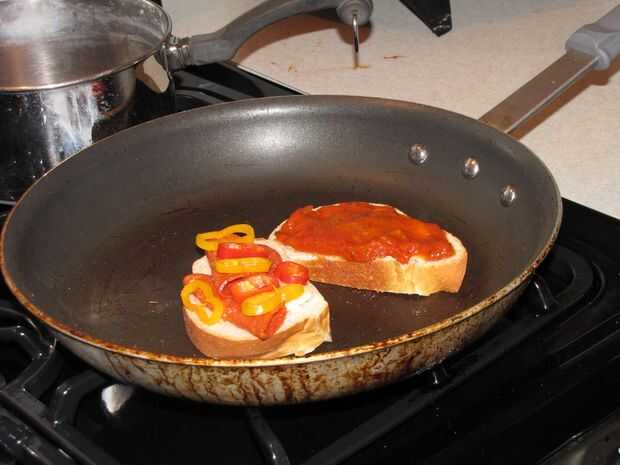 Paso 5: sobre la rebanada de pan, cuchara alguna salsa para espagueti sobre el provolone (no demasiado, no lo hacen desbordar)