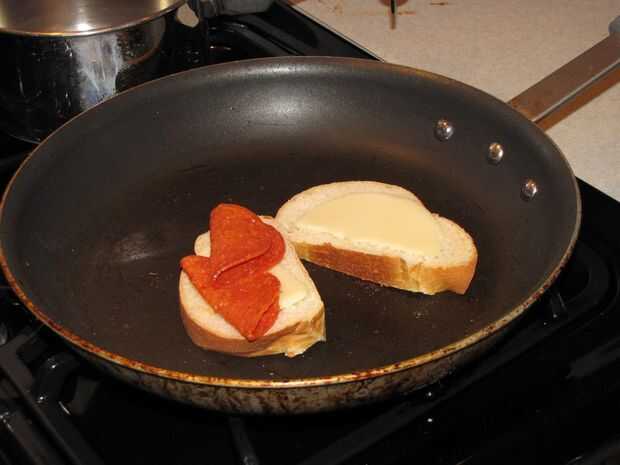Paso 3: conseguir dos rebanadas de pepperoni y doblar por la mitad (doblez duro lo suficiente para no reventar de nuevo para arriba). Poner en una de las rebanadas de pan.