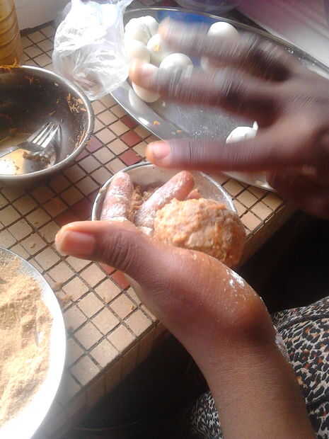 -Sujete el huevo envuelto en el doblez de la palma y espolvorear el pan rallado en todo el ti y moldeado en forma ovalada lisa.