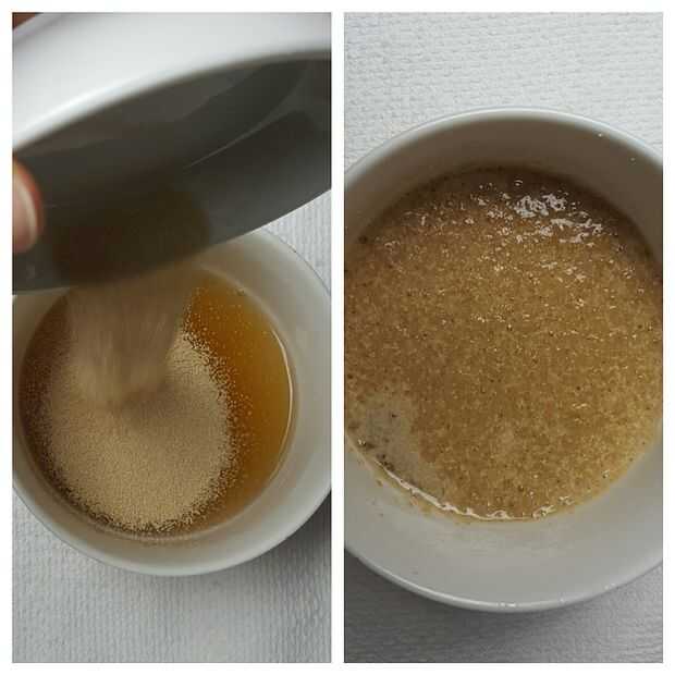 En otro tazón pequeño, combine 1/4 taza de agua tibia, la levadura y la miel. Deje la mezcla reposar 5 minutos.