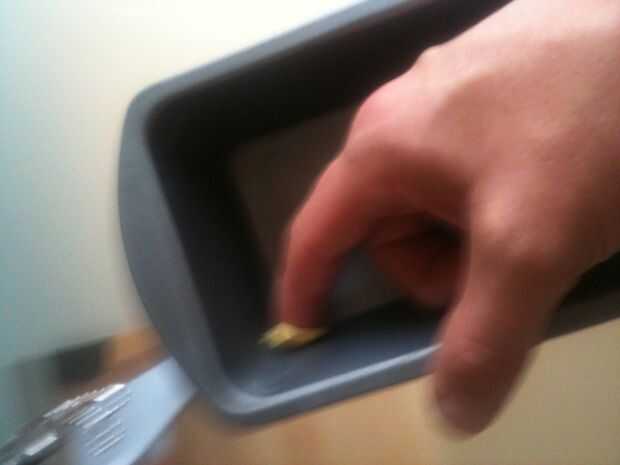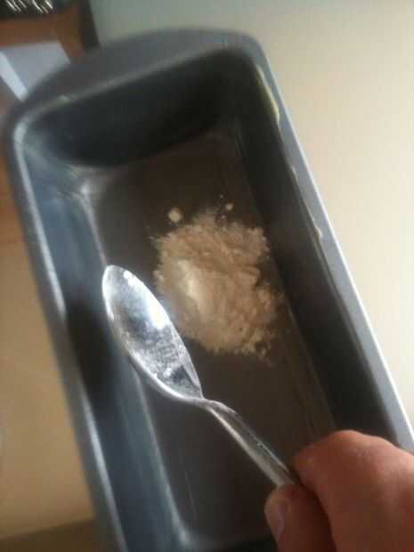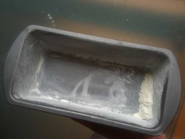 Engrasar un molde de pan pequeño (aprox. 3.5 X 2 X 7,5 pulgadas) con mantequilla, utilice sus dedos para entrar en las esquinas. Poner una cucharadita de harina en la bandeja y muévelo alrededor. La harina se adhieren a la mantequilla y cubra el interior de la lata, haciéndolo más fácil de quitar el pan al terminar.