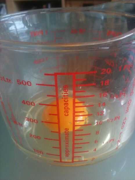 Romper el huevo en una jarra medidora. Añadir la mantequilla poco a poco hasta que la mezcla llegue a la marca de 1/2 pinta. Mezcle con un tenedor hasta que el huevo y la leche se combinan.