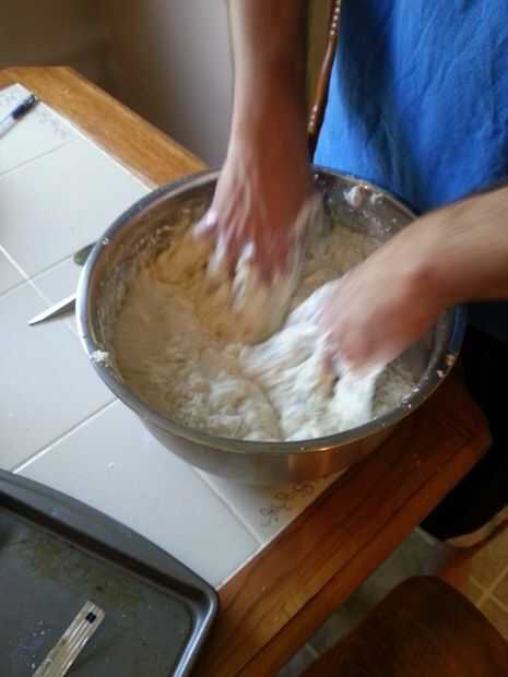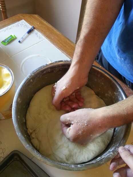 Cuchara de la levadura, mezclar luego con la mano romper cualquier grumos para distribuir la levadura en la leche. Deje que la mezcla de set por 10-15 minutos permitir que la levadura para activar. Usando sus manos bajar los bordes de la harina en la leche y empezar a mezclar la masa. Trabajar la masa con las manos para mezclar toda la harina seca en la mezcla líquida. La masa comienza a ser constante en la forma. Si la masa queda demasiado pegajosa (se pegue a las manos) después de unos cinco minutos de mezclar luego agregar harina hasta que la masa no se pega a las manos. Si la masa se convierte en escamosa o no mantiene juntos que agregó a mucho. En este caso agregar agua hasta que la mezcla se mezcla uniformemente y la masa no se pegue a las manos. Amasar la masa durante diez minutos o hasta que la masa se mezcla constantemente. Sacar la bola de masa en el tazón de fuente y grasa de los bordes de la sartén para evitar que se pegue durante el levantamiento. Coloque la masa en el recipiente y tapa. Deje resto/levar durante 45 minutos.