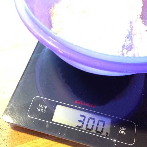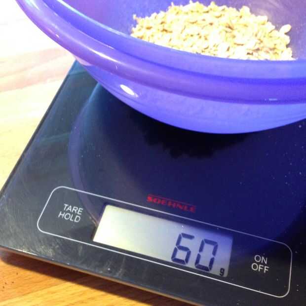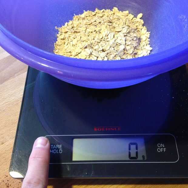 Mida 60g de avena en un recipiente sobre la báscula. Cero y medir 300g de harina en la parte superior.