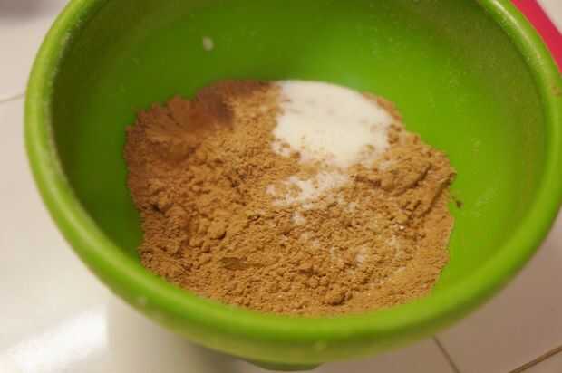 Mezclar la mitad del azúcar y el cacao en polvo con la harina. Hice este paso adicional para asegurarse de que se mezcló bien.