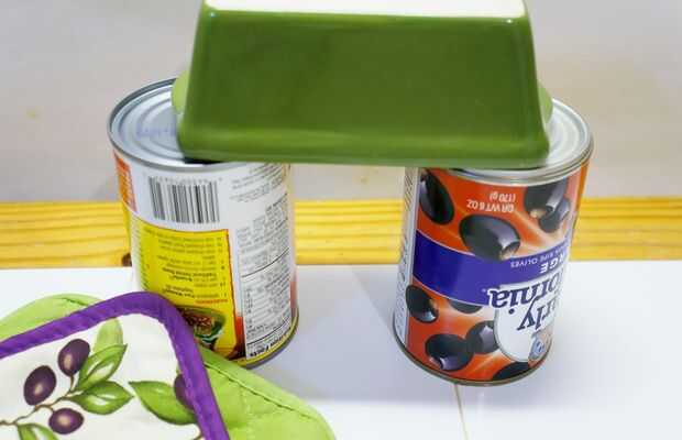 Coloque dos latas en el contador un poco aparte e invierta el pastel para que el borde de la bandeja de pan se extenderá sobre las latas. Enfriar el pastel durante 20 minutos o totalmente enfriar antes de retirar de la sartén y agregar ingredientes. Que utiliza la espátula para ir alrededor de los bordes de la cacerola para aflojar el pastel y vuelta cuidadosamente la bandeja para retirar la torta.