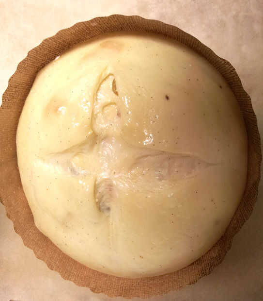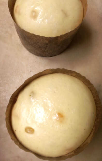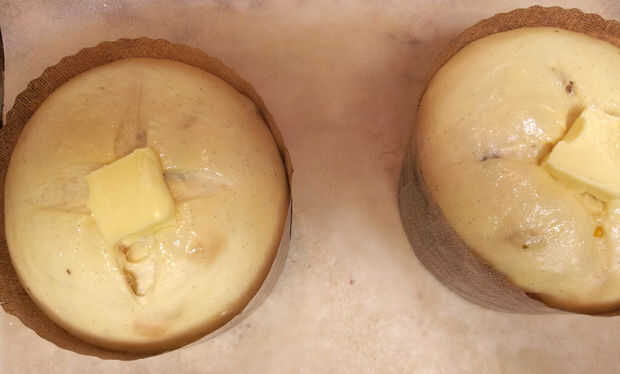 Finalmente es tiempo de cocción! Precalentar el horno a 325 grados. Utilice un cuchillo afilado y anotar una marca 'X' sobre la parte superior de cada pan dulce. Lugar un smalle pedazo de mantequilla en el centro de la 'X' marca. Esto ayudará el pan levantarse y dar la parte superior un bonito color dorado. Coloque el panettone en una hornada y traslado al horno; hornear hasta que el oro marrón, 25 a 30 minutos.