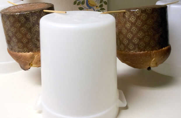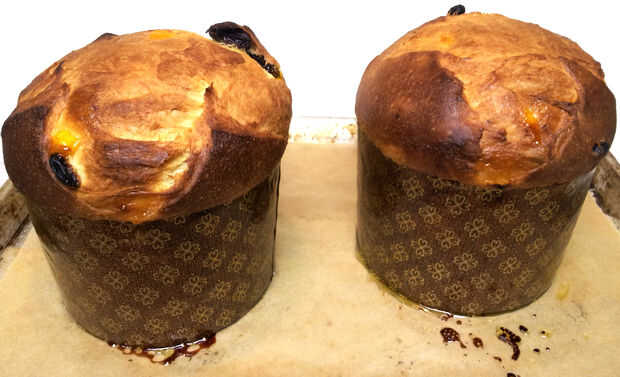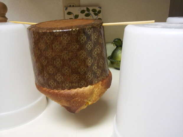 Retire panettone de hornear. Inserte uno o dos pinchos de bambú de 12 pulgadas a través de la parte inferior de la mitad de cada pan dulce y suspender cada uno boca abajo entre dos cubos o cajas para 2-3 horas hasta que estén frías antes de servir, o 6 horas antes de poner en el paquete de regalo.