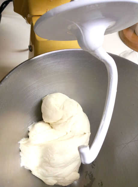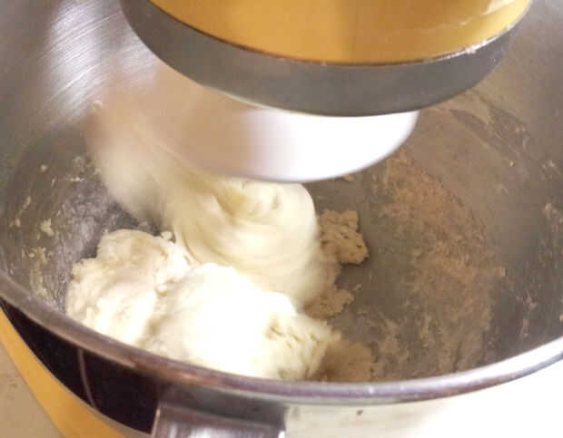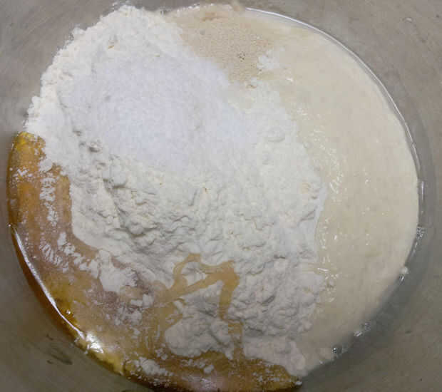 Añadir harina, agua, levadura, sal, miel, vainilla a la esponja en el recipiente mezclador, otra vez con la masa del gancho accesorio.  Mezclar a velocidad baja hasta bien combinado, luego a velocidad media-alta (velocidad 6 cocina ayuda) unos 3-4 minutos.