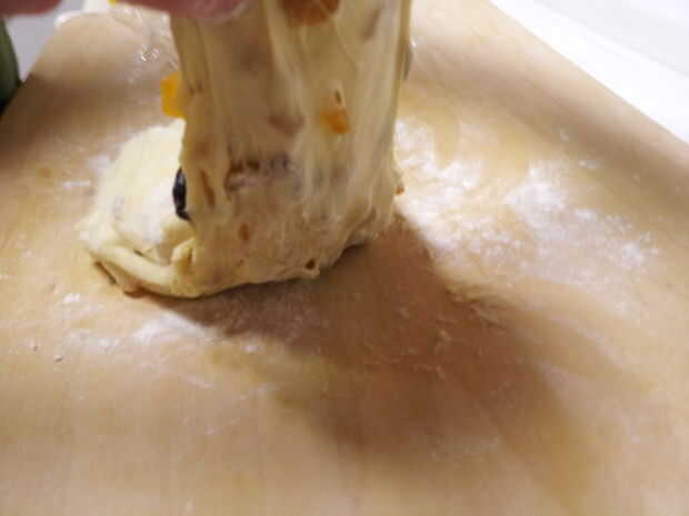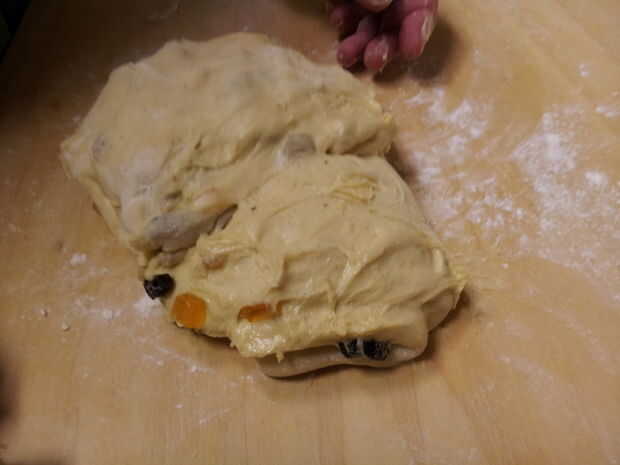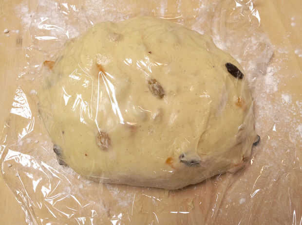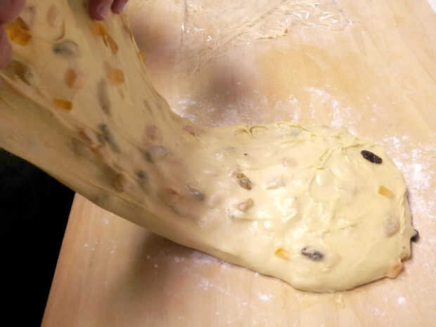 Tramo y doble la masa 4 veces en 4 direcciones, ver foto. Si la masa es demasiado pegajosa, polvo harina mientras trabaja. Formar masa otra vez en una ronda, cubrir con papel plástico y dejar reposar otros 30 minutos a temperatura ambiente.