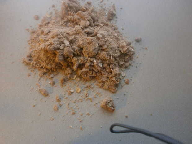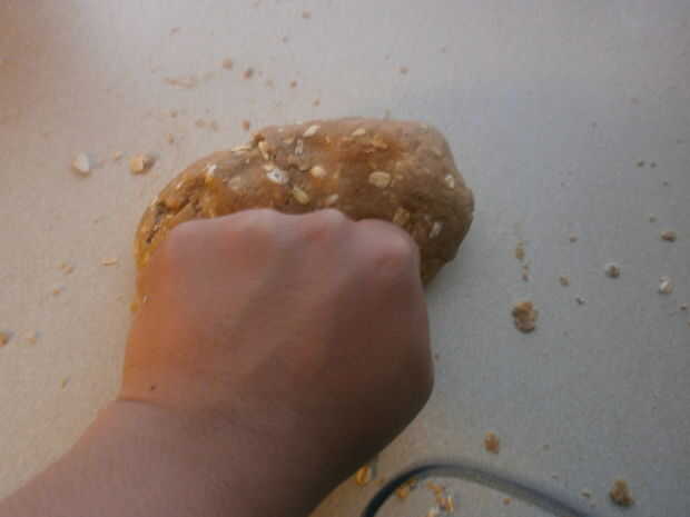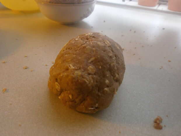 Cuando no se revuelve la mezcla con la cuchara ya, es hora de amasar la masa. Vaciar el contenido de la taza sobre la mesa/Banco y empezar a amasar. Por alguna razón, sólo derramé 75 ml de agua en el vaso los ingredientes secos, por lo que resultó como migajas. Por lo tanto, he añadido otro 75 ml, ya que esta receta requiere para 150 ml de líquido. Empezar a amasar la masa, hasta que consiguió una consistencia como masa de pan de jengibre. Debe ser un poco pegajosa. Cuando has amasó, formar una bola y dejamos reposar durante 10 minutos, mientras que usted puede empezar a limpiar. :)